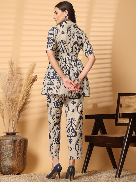Blue and beige printed tunic, has a lapel collar and short sleeves