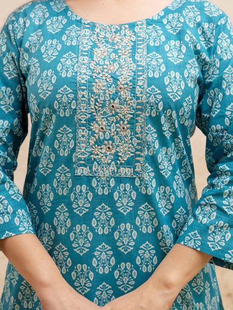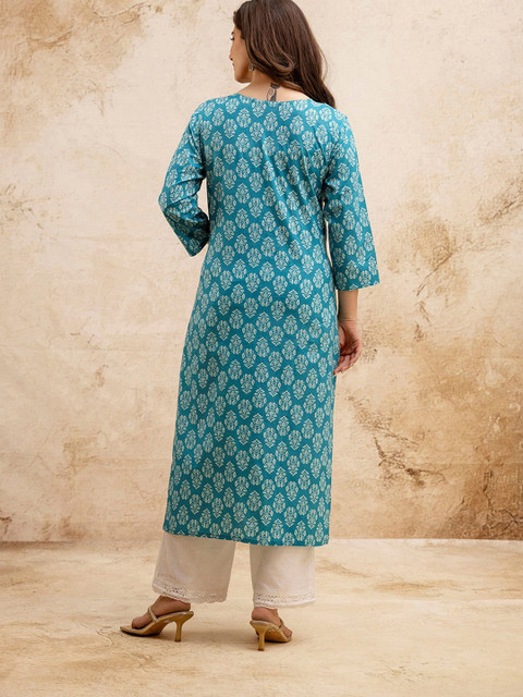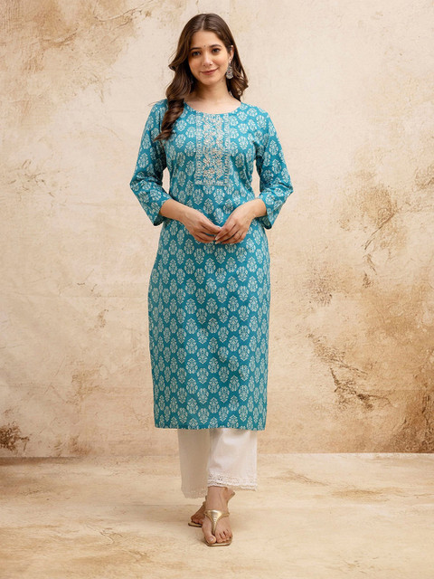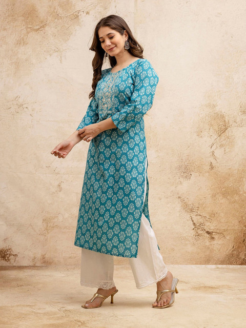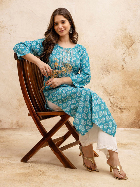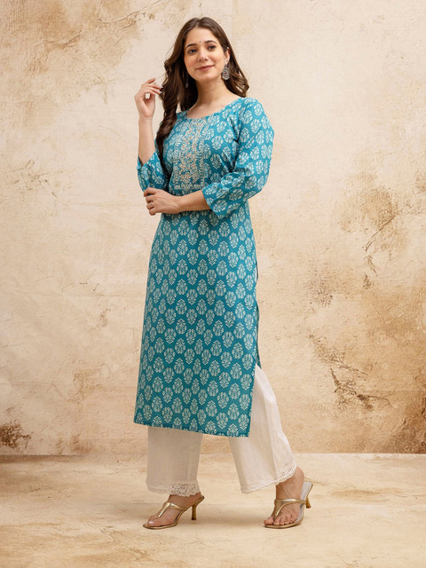 Turquoise Blue & White Straight kurta for Women