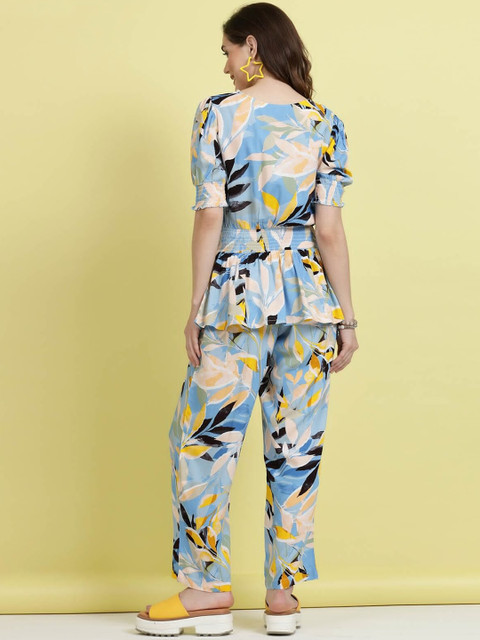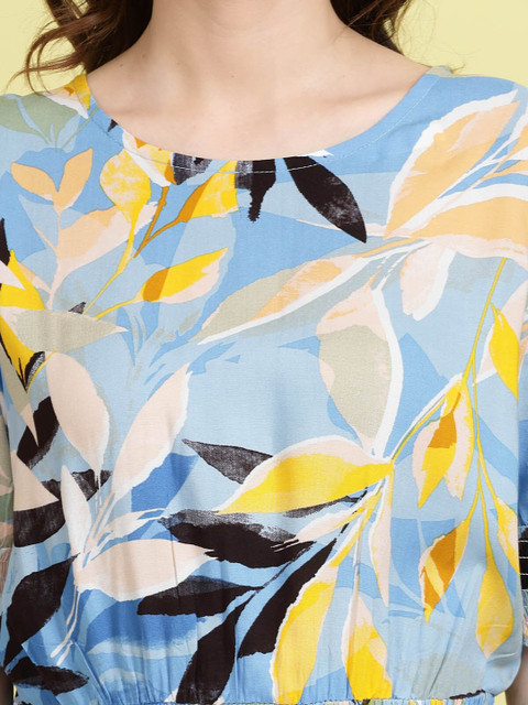 Blue & beige printed top with elastic details on waist, has round neck, half sleeves with elastic details & slip on closure