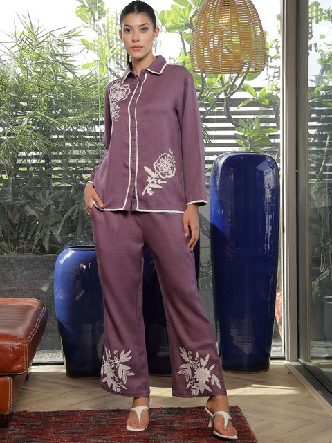 Lavender-colored embroidered shirt, has a shirt collar neck and long sleeves, secured with button closure