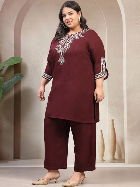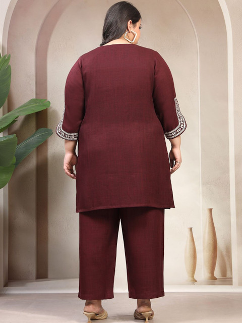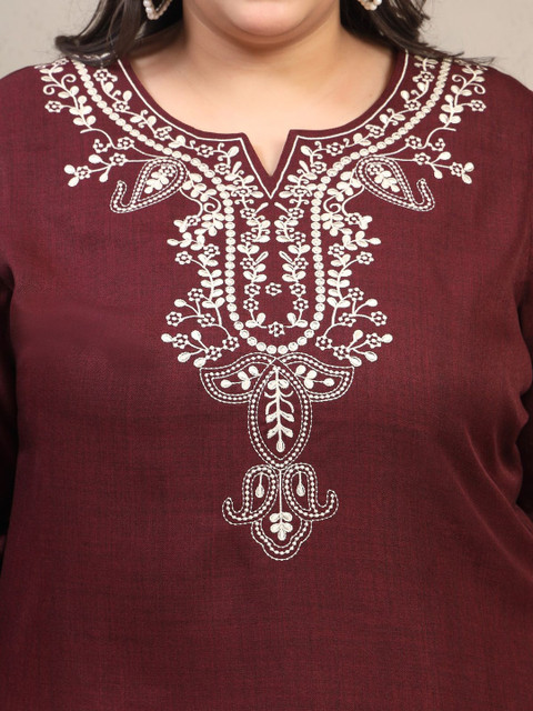 Maroon and white embroidered tunic, has a shirt collar neck and three quarter sleeves, secured with slip-on closure