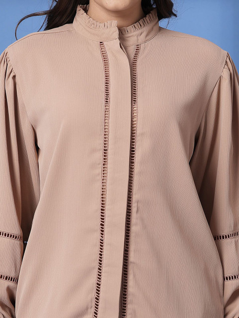 Peach colored solid shirt, has a mandarin collar- neck and long sleeves, Secured with hook closure
