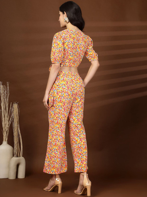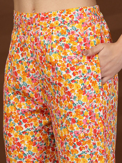 Yellow and red , blue printed palazzo, has an elasticated waistband with slip-on closure has 2 pockets