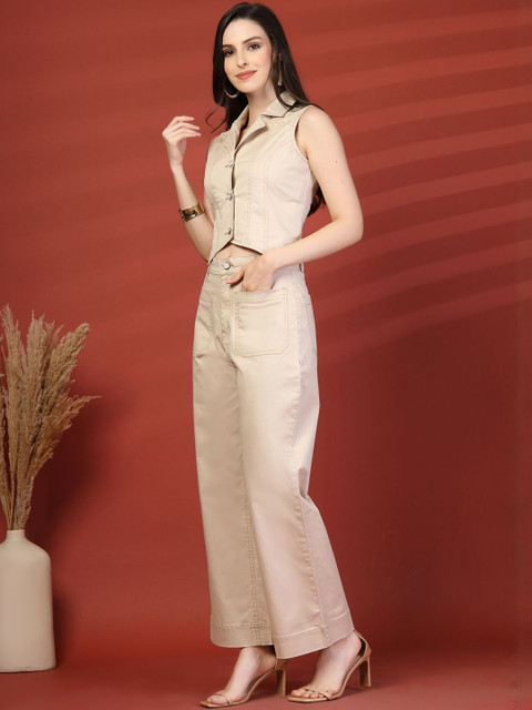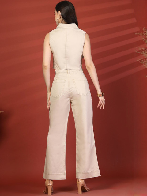 Beige top, has shirt collar, no sleeves, full placket button closure