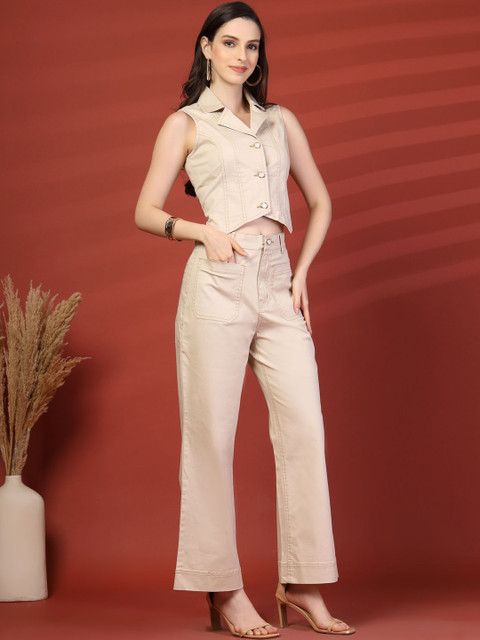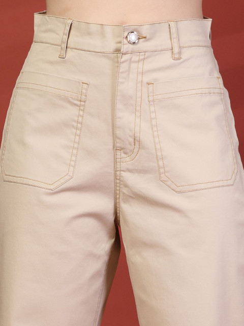 Beige mid-rise trousers, has button closure, two side pocket and straight hem