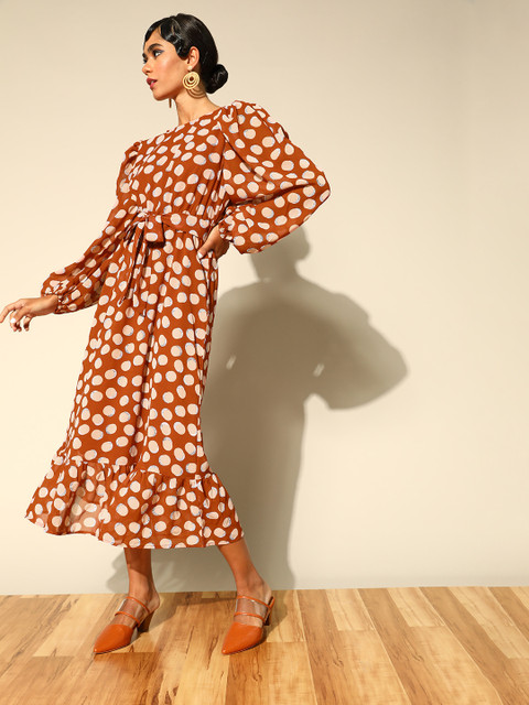 I have no words for this beautiful dress.. Calf length with lining. Opaque and look do elegant. Go for movie Date with this dress.. You ll look cute and stylish.. Fit and flare midi dress with ruffle bishop sleeves. So if you don’t want to show your arms.. Its the best buy.. Don’t worry about the fabric. U can wear it in summers as well.. No. Tanning.