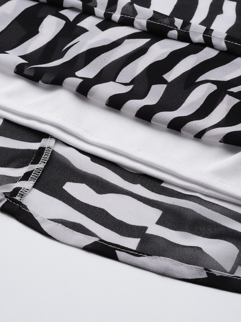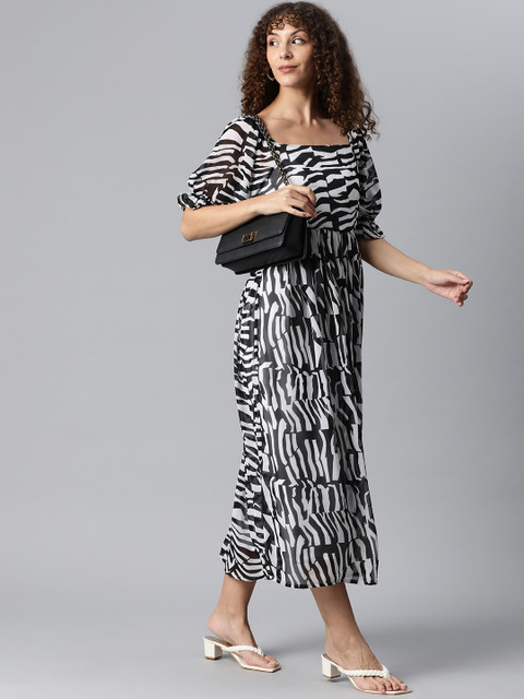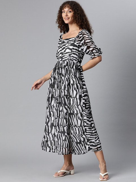 3 reviews for plusS Women Black & White Printed Square Neck Bell Sleeves Midi Dress with Ruffle Detail