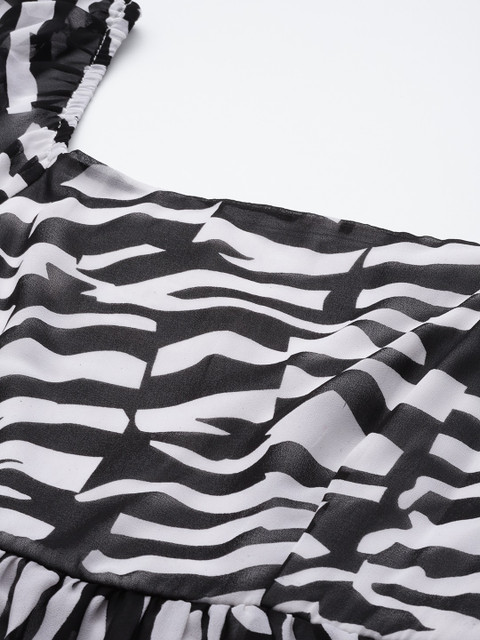 plusS Women Black & White Printed Square Neck Bell Sleeves Midi Dress with Ruffle Detail