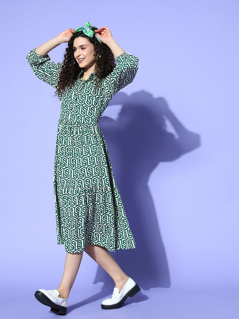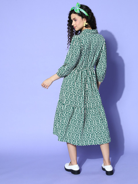Look feminine and chic by donning this alluring dress for your next outing. Its charming geometric pattern and shirt collar will add to your appeal.