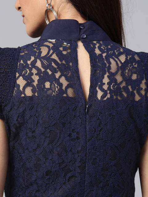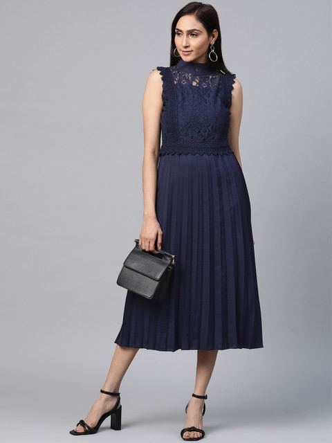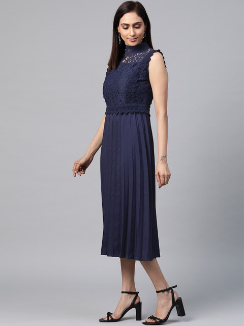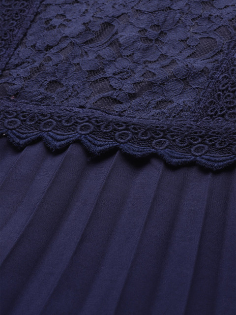 Navy Blue floral lace detail accordion-pleated woven A-line dress, has a mandarin collar, sleeveless, button and concealed zip closure at the back, and flared hem