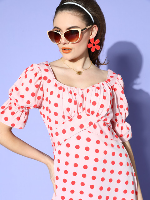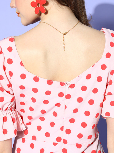 Step out in style donning this modish dress. It is crafted with a polka dotted pattern and an attractive sweetheart neck for added appeal.