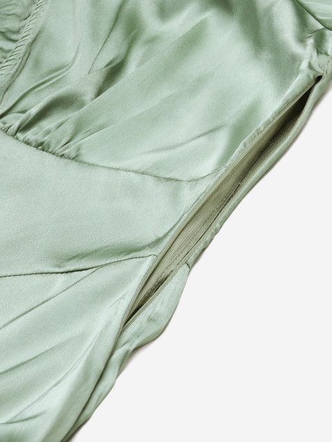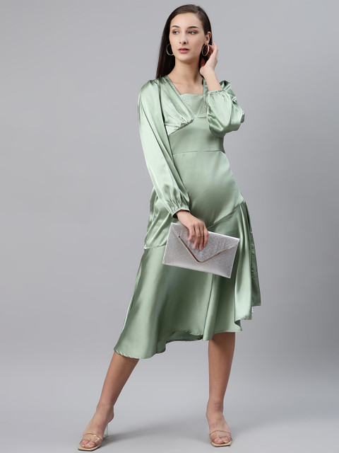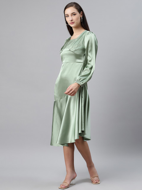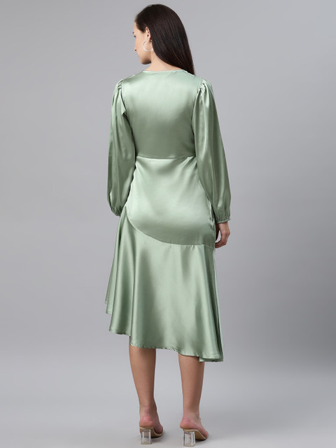 Sea Green solid woven midi A-line dress, has an asymmetric neck, long puff sleeves, concealed zip closure, and asymmetric hem