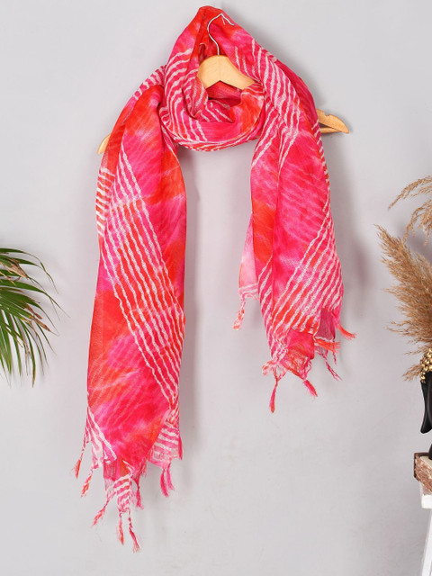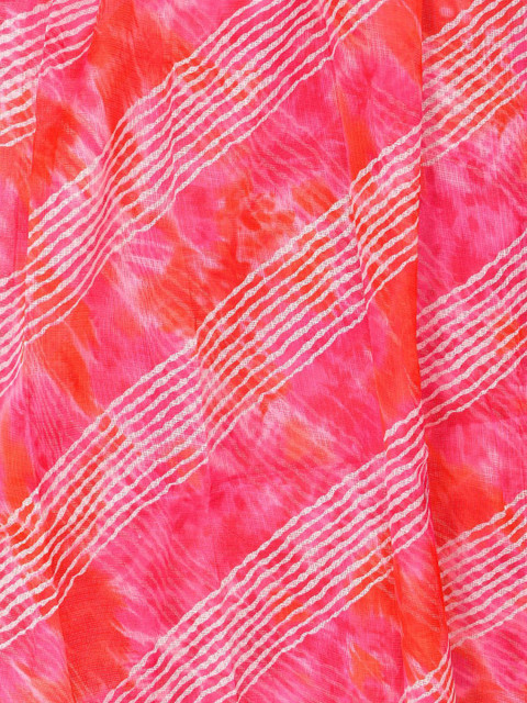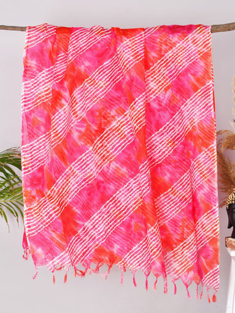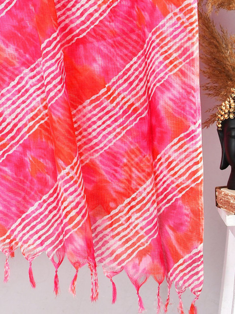 Pink, White and Orange leheriya tie & dyed kota doria dupatta has leheriya technique, tasselled border