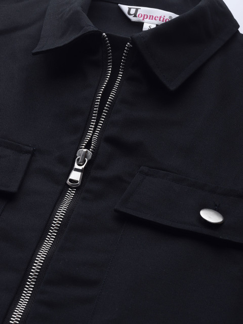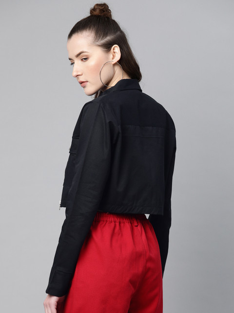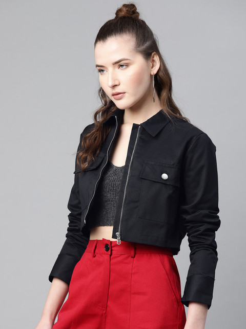 Black solid crop jacket, has a spread collar, zip closure, long sleeves, two pockets, straight hem