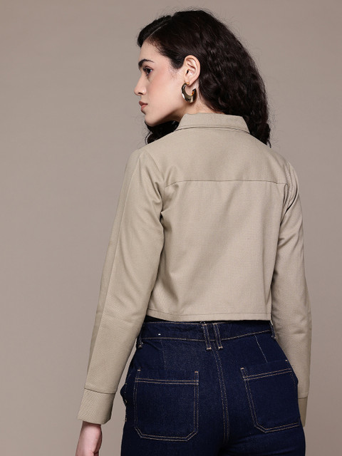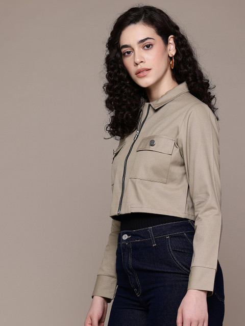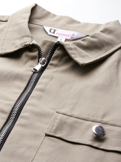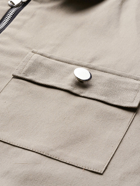 Taupe solid denim jacket, has a spread collar, 2 pockets ,has a zip closure, long sleeves, straight hemline, without lining
