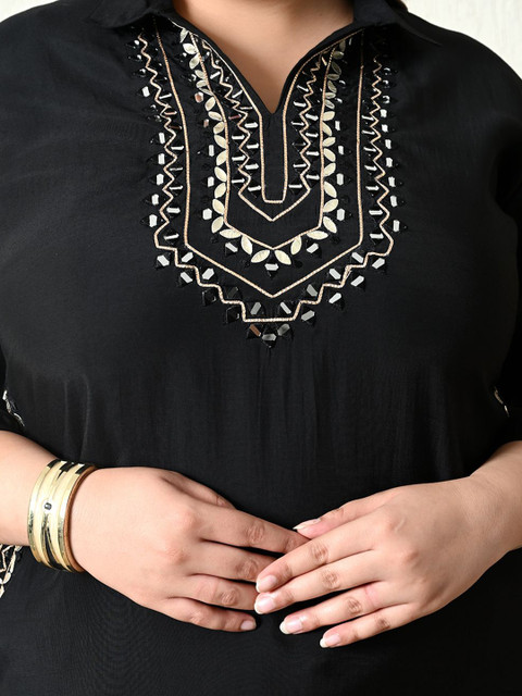 Black & gold-toned embroidered tunic, has a shirt collar neck and three-quarter sleeves
