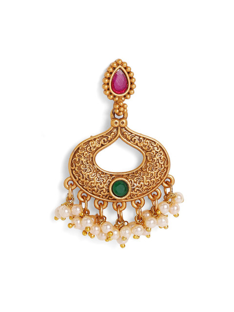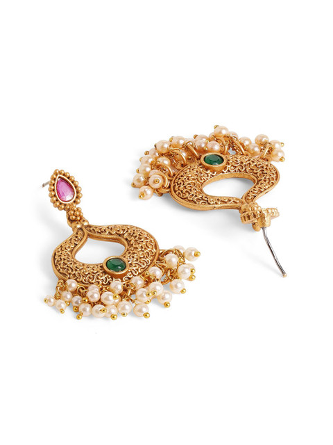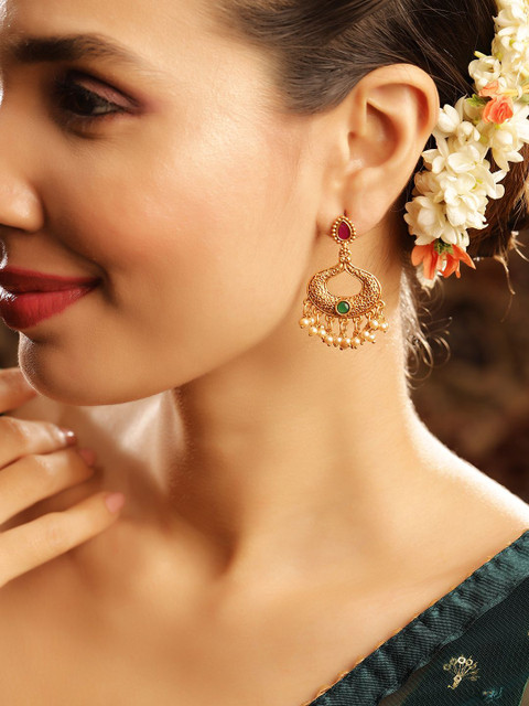 Gold-toned, green & red contemporary chandbalis, gold-plated, has artificial stones and beads studded