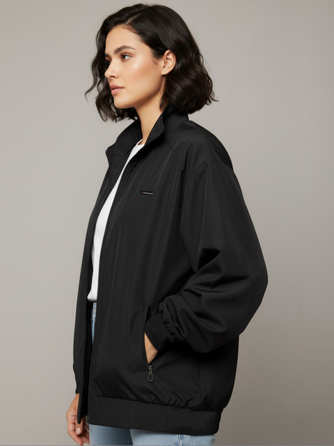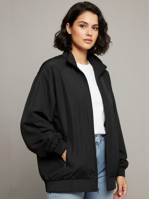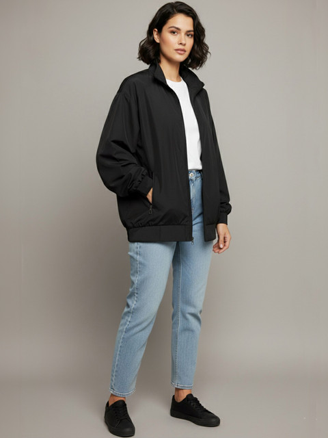 Black solid lightweight bomber, has a stand collar, 2 pockets ,has a zip closure, long sleeves, straight hemline, polyester lining