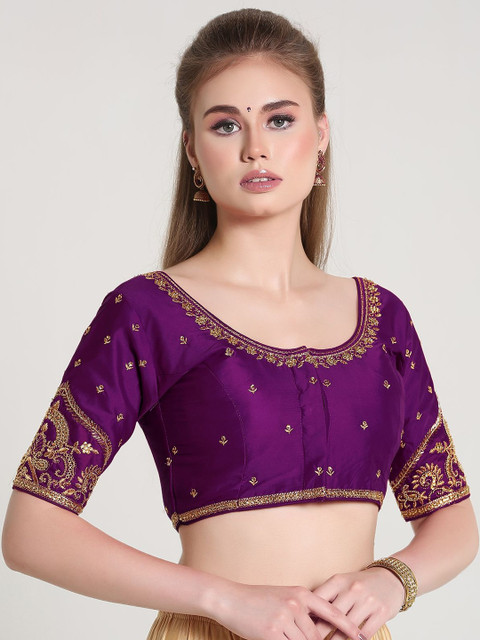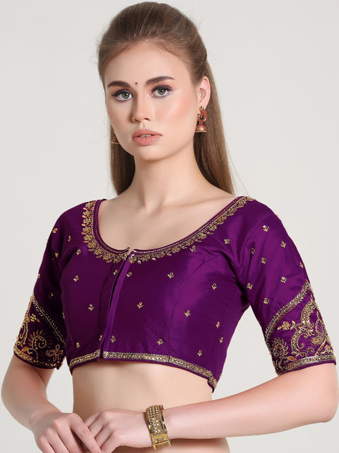 Purple embroidered padded blouse has a round neck, short sleeves, and hook and eye closure with tie-up detail