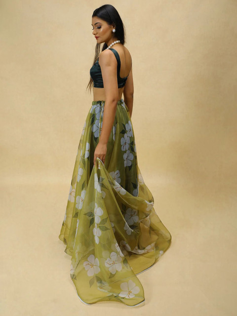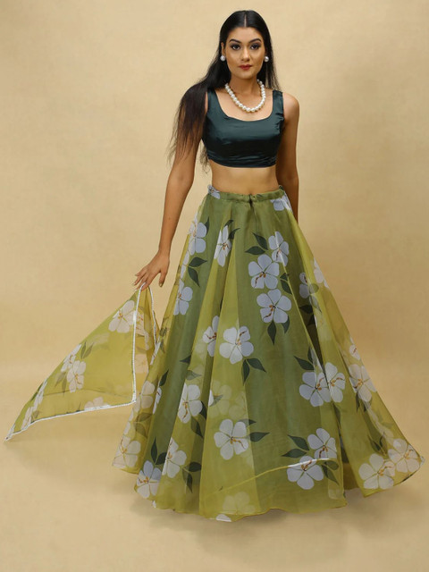 Green and white printed semi-stitched lehenga, flared hem