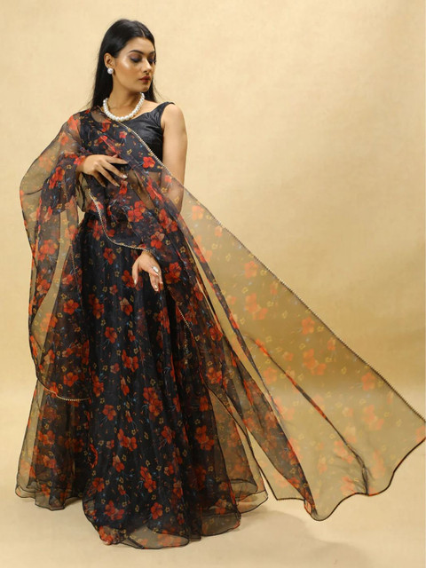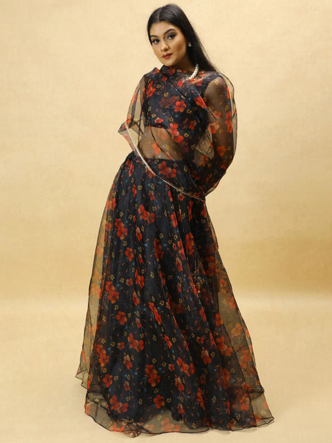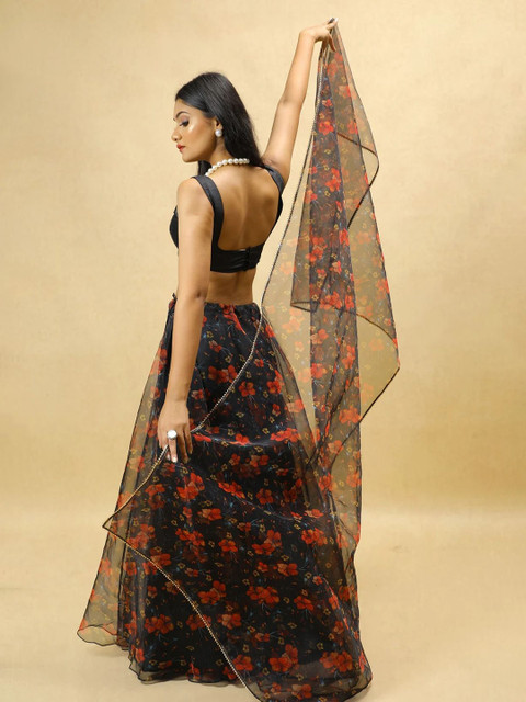 Black and red printed ready to wear blouse, has a v-neck, sleeveless, black and red printed semi-stitched lehenga, flared hem