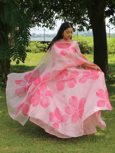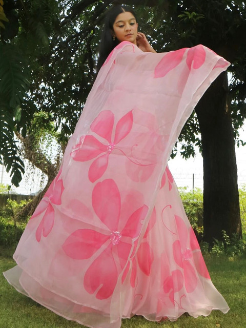 Pink printed ready to wear blouse, has a round neck, sleeveless, pink and printed semi-stitched lehenga, flared hem