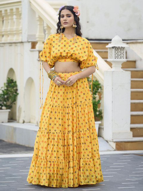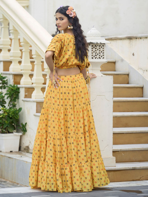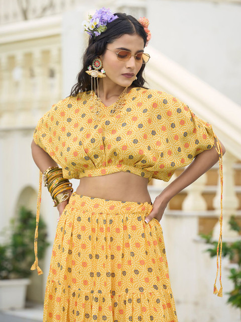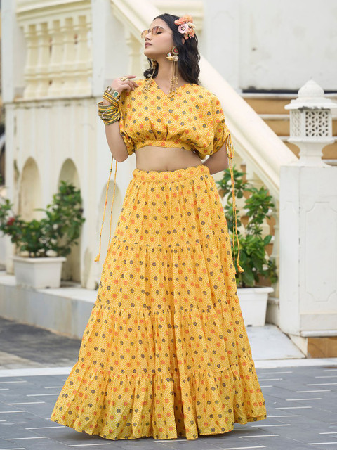 Yellow and red printed unstitched blouse, has a v-neck, long sleeves, yellow and red printed ready to wear lehenga, has zip closure, flared hem