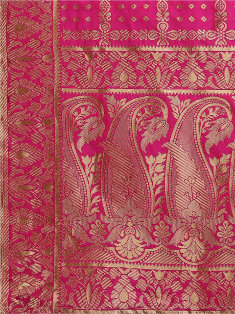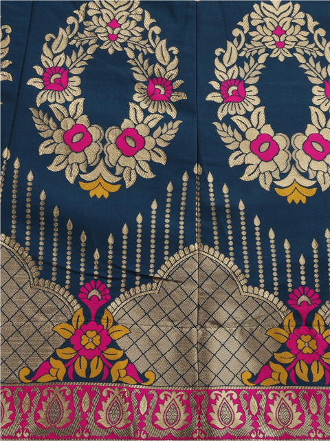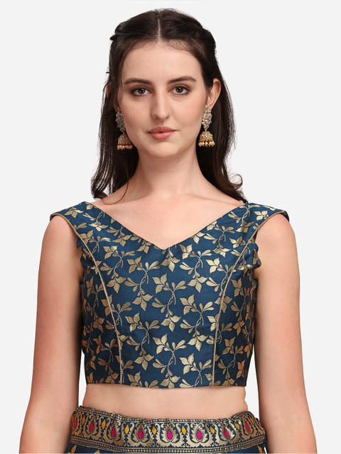 Teal and magenta woven design unstitched blouse, has a v-neck, sleeveless, teal and magenta woven design ready to wear lehenga, has zip closure, flared hem