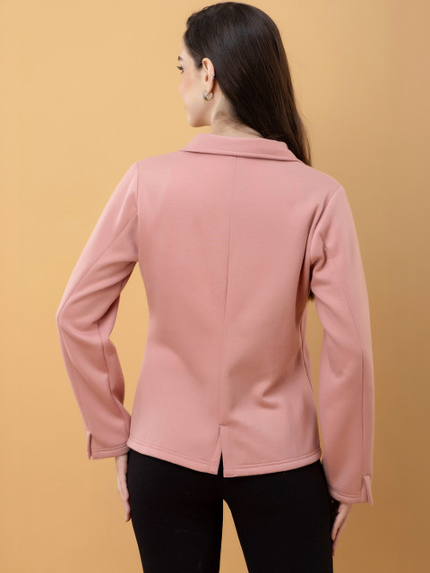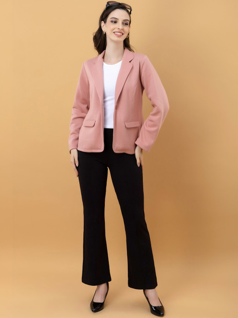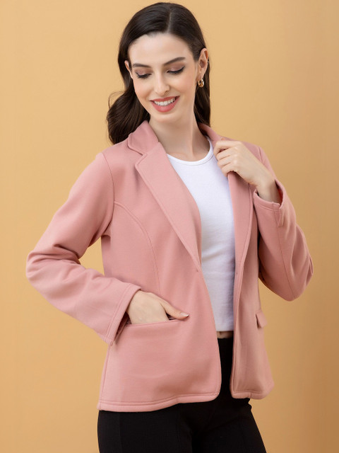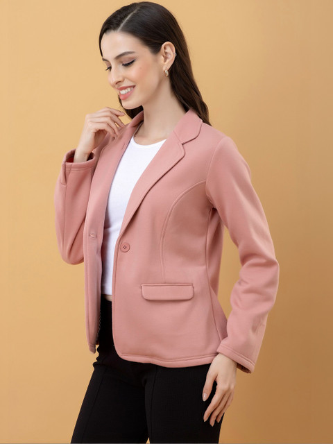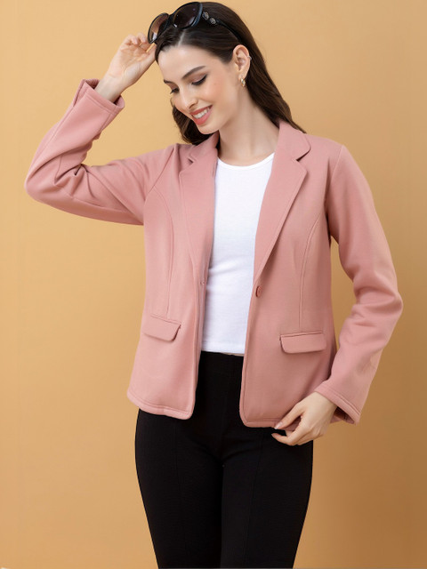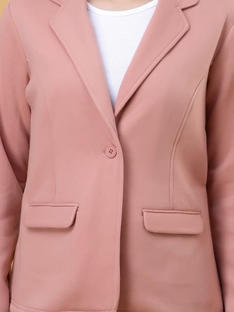Pink solid lightweight tailored jacket with utility pockets, has a lapel collar, 2 pockets ,has a button closure, long sleeves, straight hemline, without lining