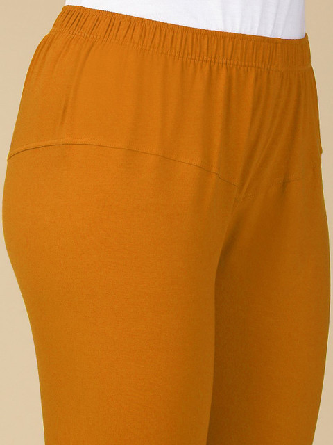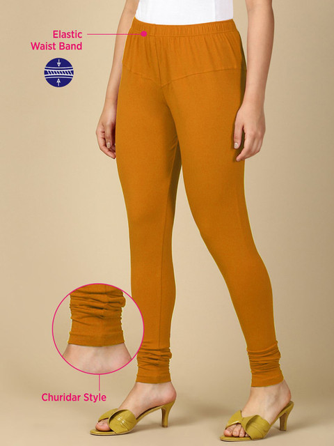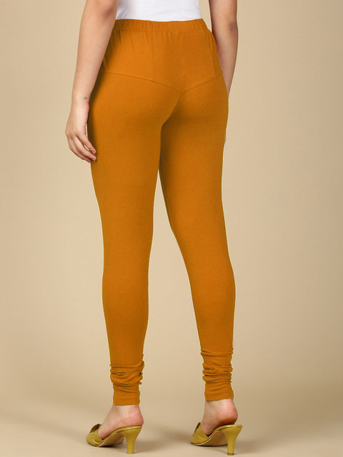Mustard yellow solid churidar-length leggings, has an elasticated waistband with slip-on closure