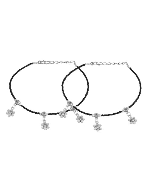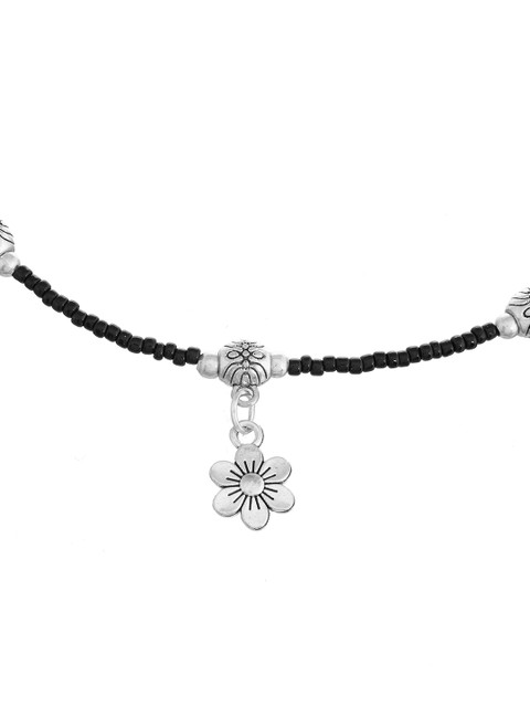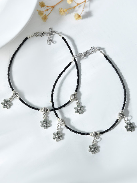 Silver-toned and black oxidised german silver anklets, has artificial beaded details