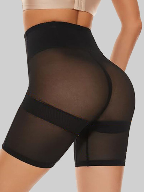Black solid tummy and thigh shaper has an elasticated waistband, and a double-layered gusset