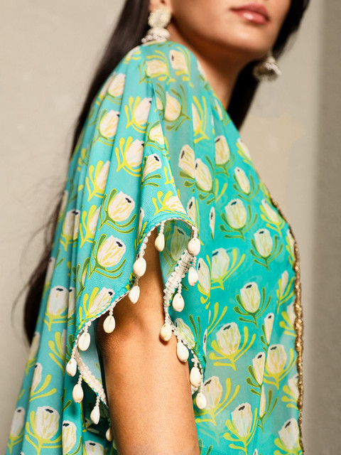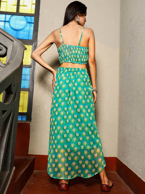 Green floral printed crop top, has shoulder straps and secured with zip closure
