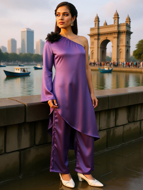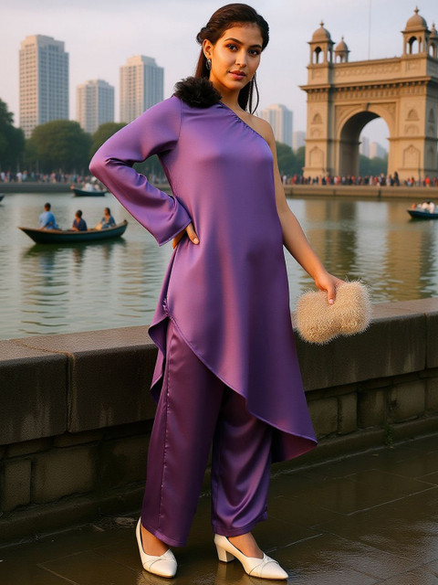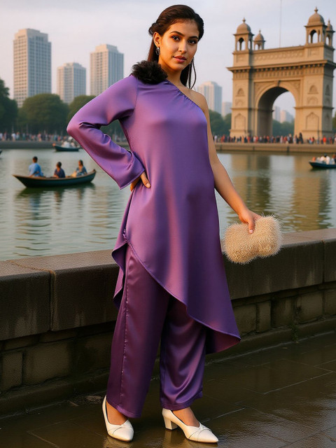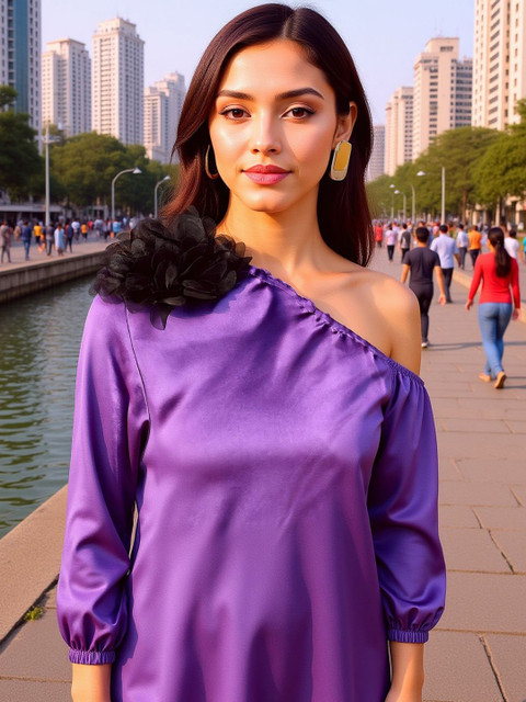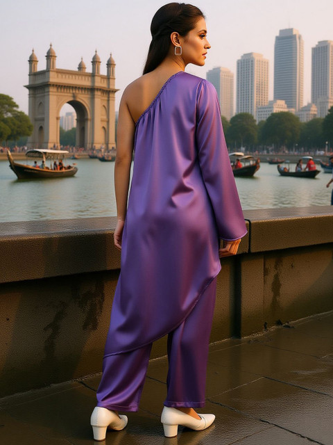 Purple solid tunic, has a one shoulder neck and long sleeves, Secured with slip on closure
