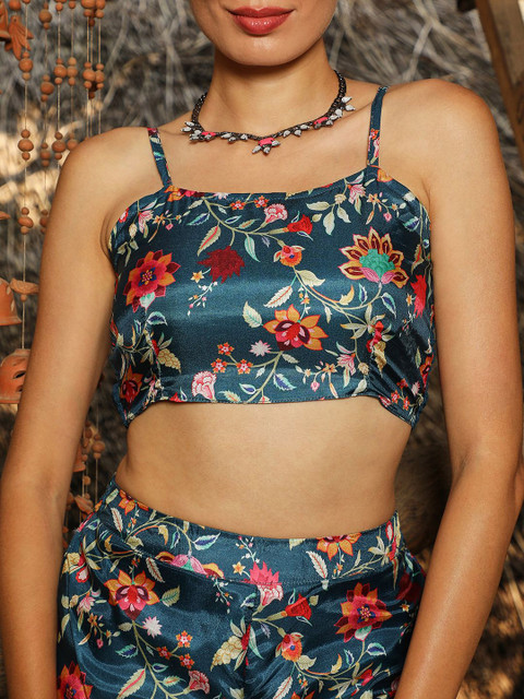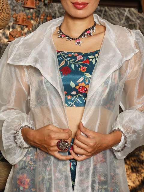 QISSA Printed Square Neck Top, Trousers & Shrug Co-Ords