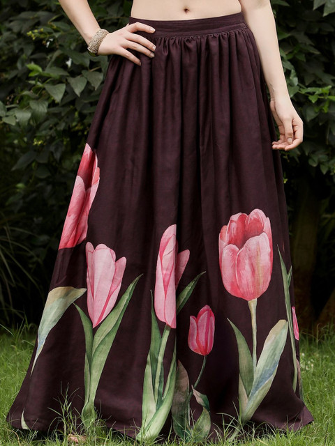 Purple, pink and green floral print skirt, has an elasticated waistband with slip-on closure