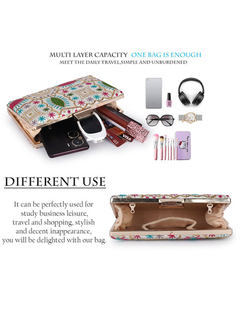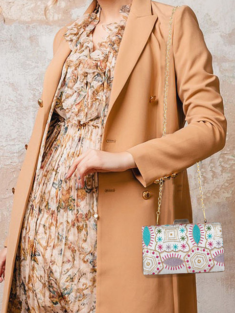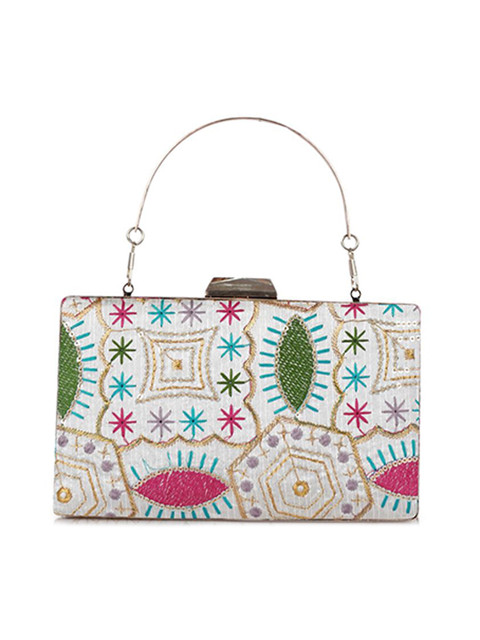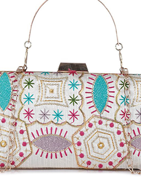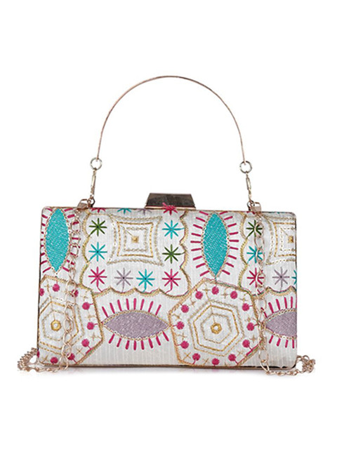 White , pink and blue embellished box clutch