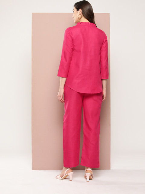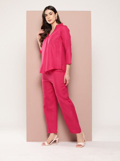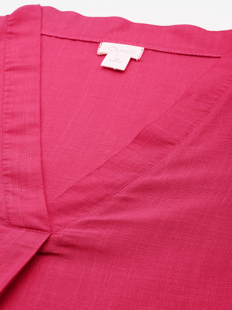 - Magenta solid Top , has a v-neck, has three-quarter, regular sleeves, button closure