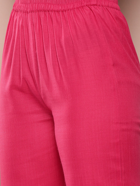 - Magenta solid Trousers, has an elasticated waistband with a slip-on closure