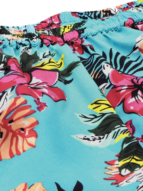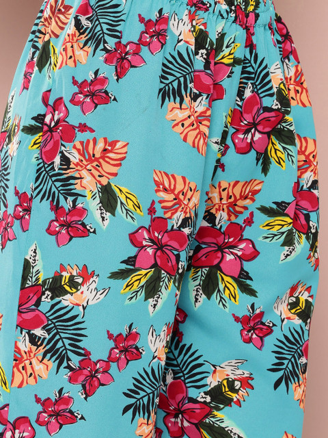 • Turquoise blue and multicoloured floral printed Trousers, has an elasticated waistband with a slip-on closure