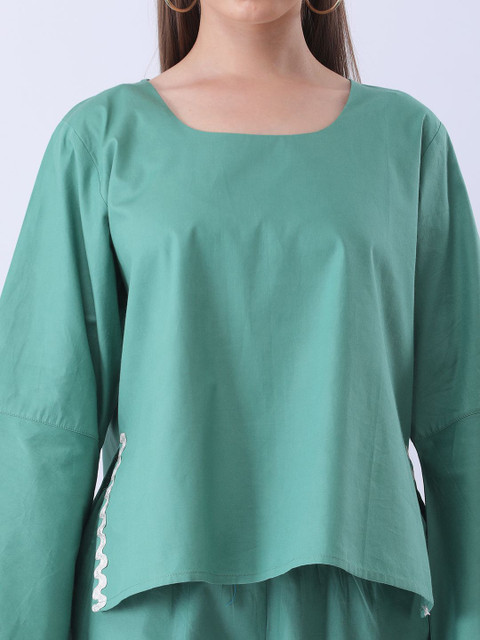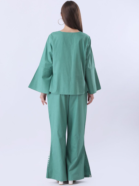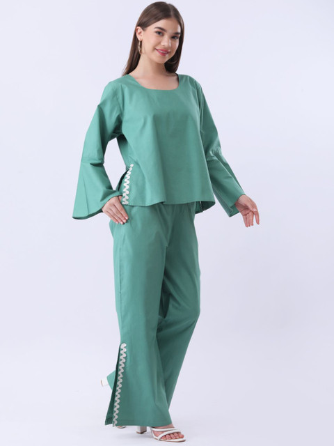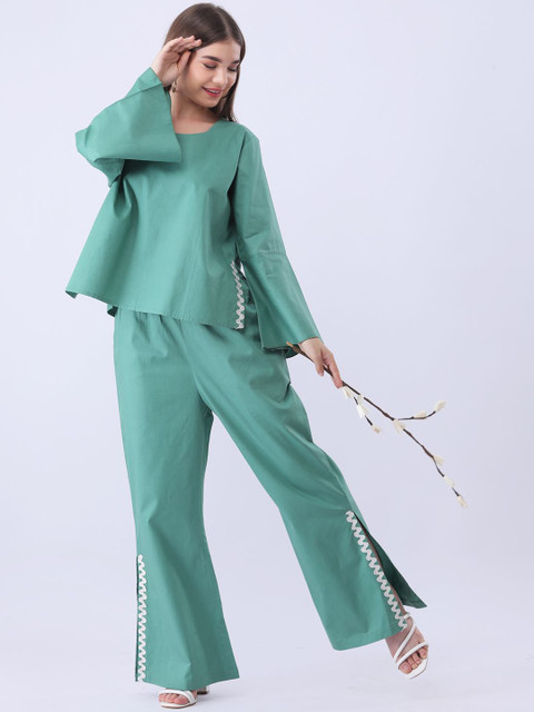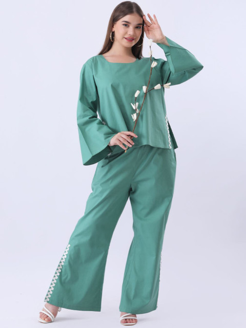 Green & white solid mid-rise trousers, has slip-on closure, two pockets and Straight hem