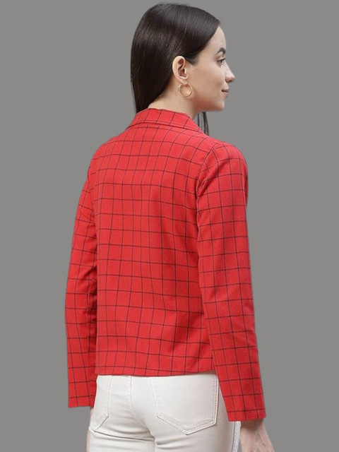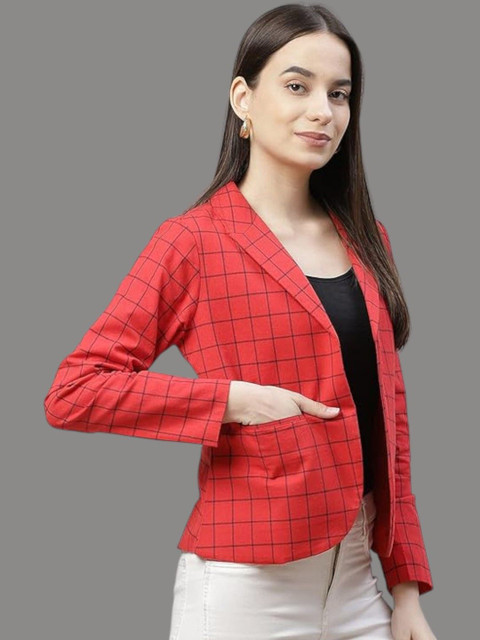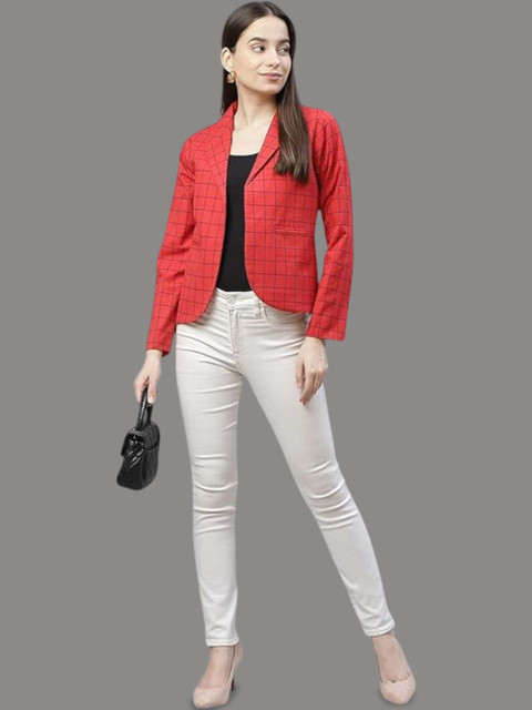 Red checked regular-fit smart-casual blazer, has a notched lapel, long sleeves, single-breasted with front open, two pockets and a ventless back hem