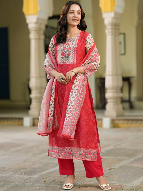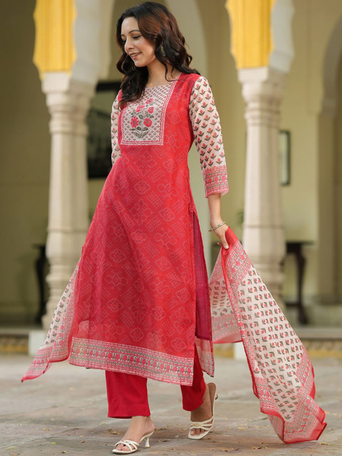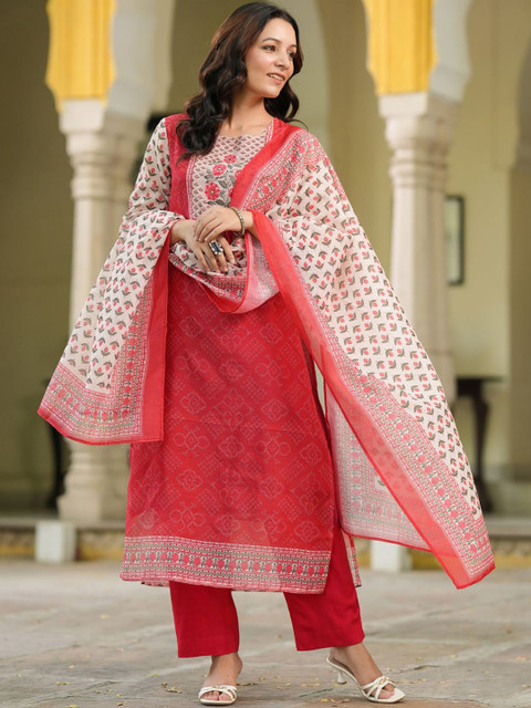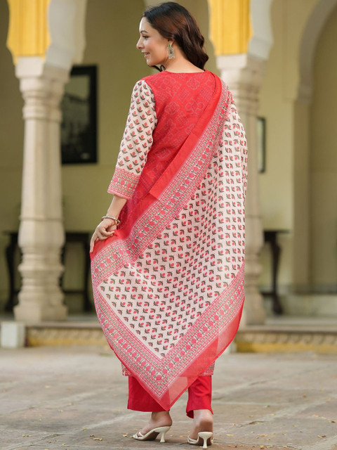 Red, white and green printed kurta with trousers with dupatta
