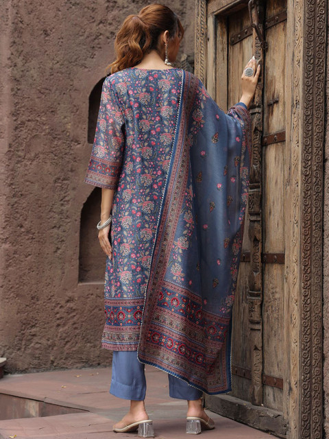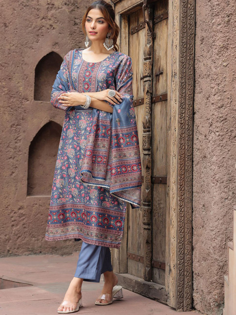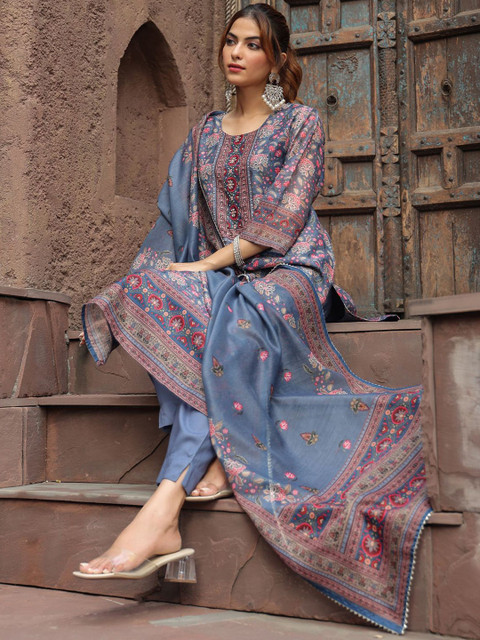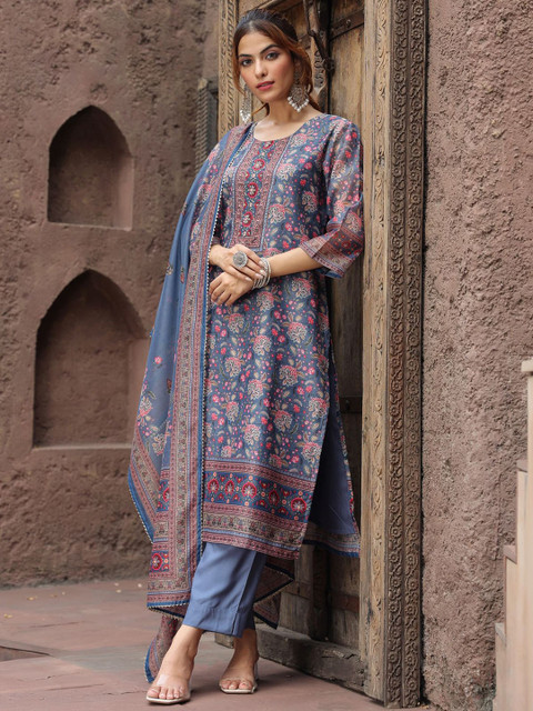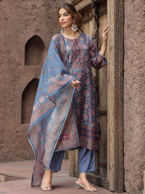 Grey, pink & white printed Kurta with Trousers with dupatta