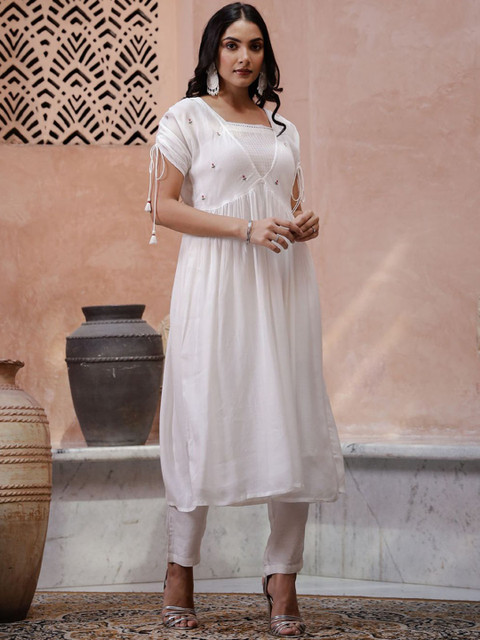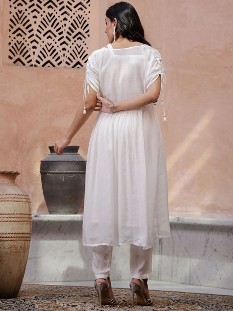 White and red solid Kurta with Trousers