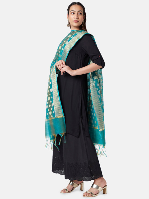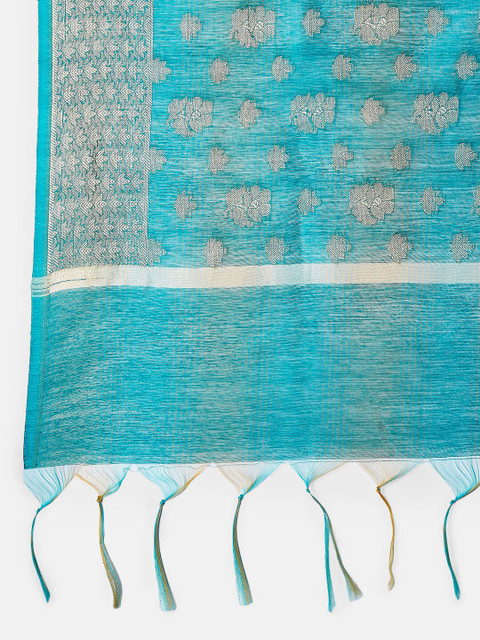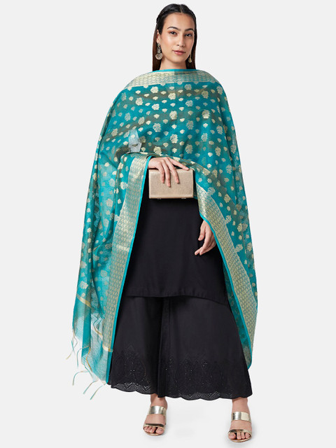Teal and gold-toned floral woven design dupatta zari, tasselled border