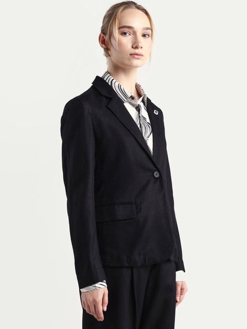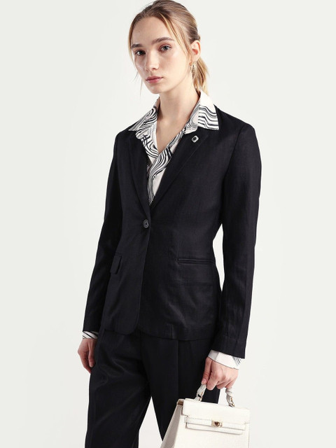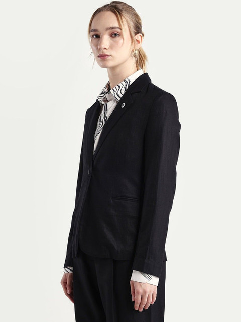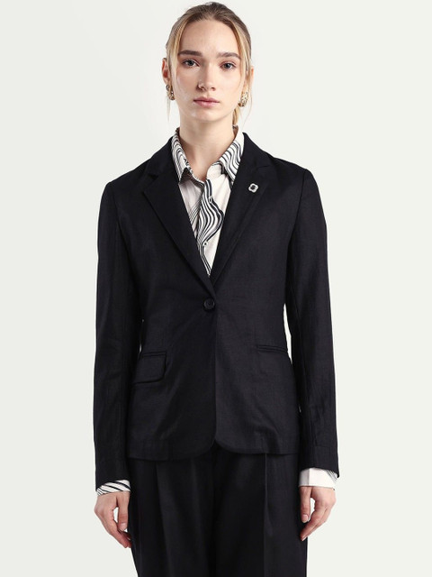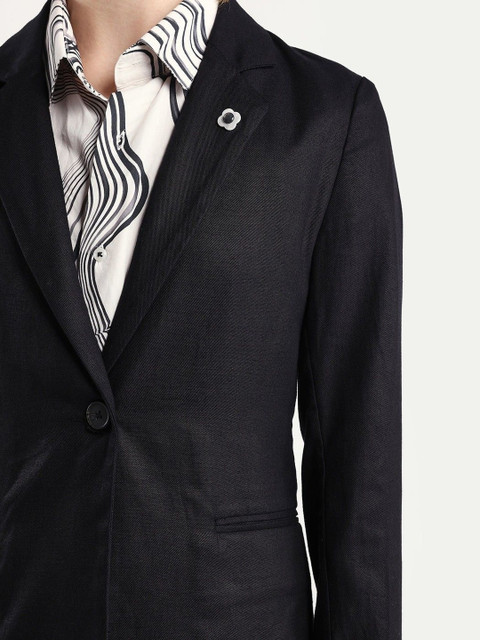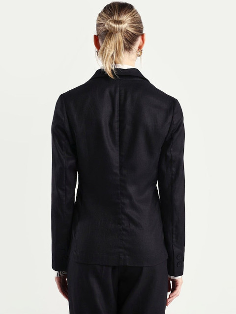 Black solid slim-fit single-breasted blazer, has a notched lapel collar, long sleeves, with double button closure, two flap pockets and a ventless back hem