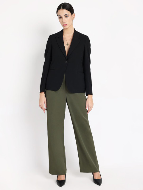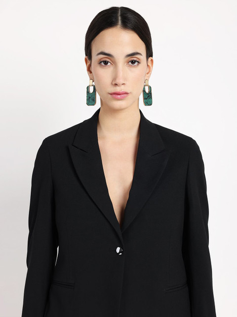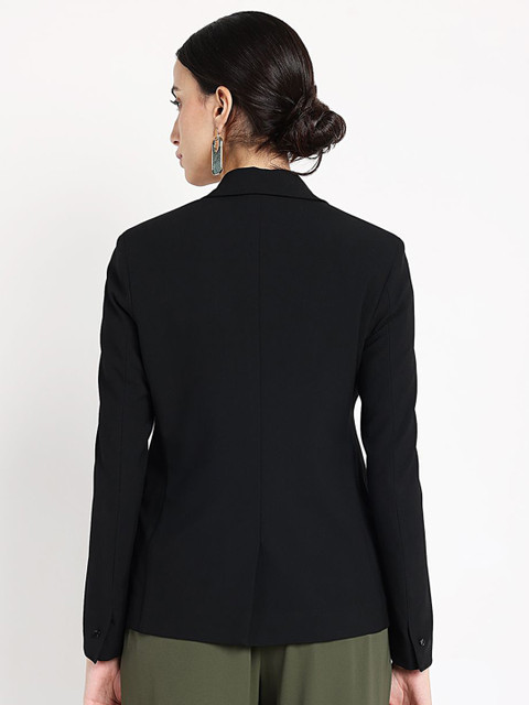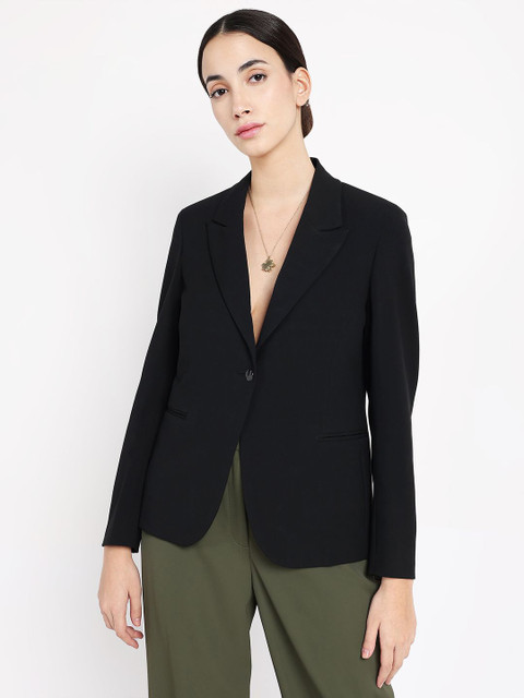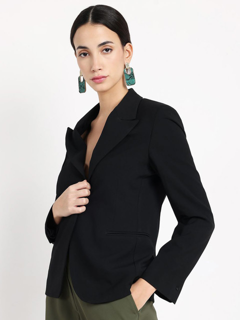 Black solid regular-fit single-breasted blazer, has a Notched Lapel collar, long sleeves, Single Vent, Button closure & curved hem with two Pockets