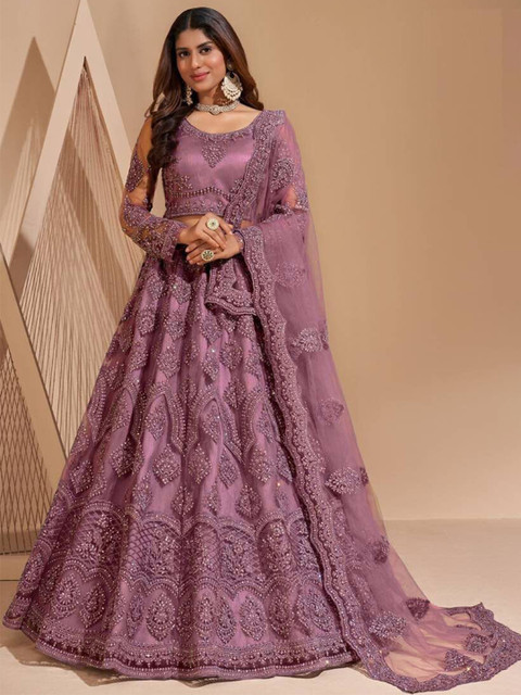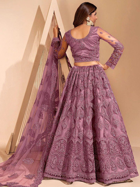 Purple embellished unstitched blouse, has a round neck, long sleeves, zip closure