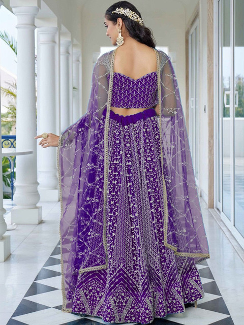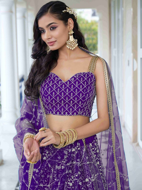 Purple embellished semi-stitched blouse, has a round neck, sleeveless, purple embroidered semi-stitched lehenga, flared hem